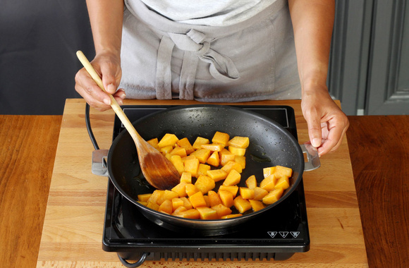 4Découpez le potiron en dés et faites les revenir dans une poêle avec 2 cuillères à soupe d'huile d'olive. Ils doivent être tendres mais pas en purée. Salez et poivrez.
