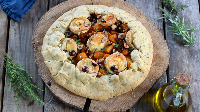 8Ajoutez les noisettes concassées, saupoudrez le tout de thym frais puis repliez les bords de la pâte sur la garniture.