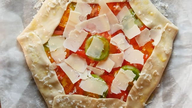 Ajouter les rondelles de tomates, un filet d'huile d'olive puis rabattre les bords sur la garniture. Avec un pinceau, badigeonner la garniture avec un peu d'huile d'olive et déposer un peu de parmesan sur la bordure. Détailler le reste en copeaux directement sur les tomates.