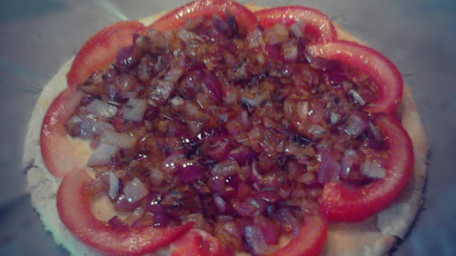 Délicieuse tarte aux oignons rouges cuisinés et tranches fines de tomates.