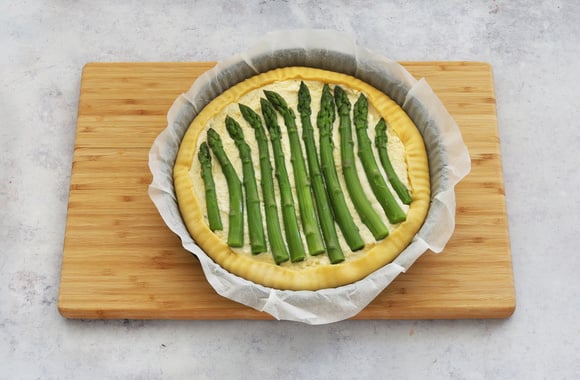 11Disposez les asperges bien égouttées sur la garniture en pressant légèrement. Rabattez les bords de la pâte sur la garniture. Enfournez et faites cuire la tarte 35 à 40 minutes.
