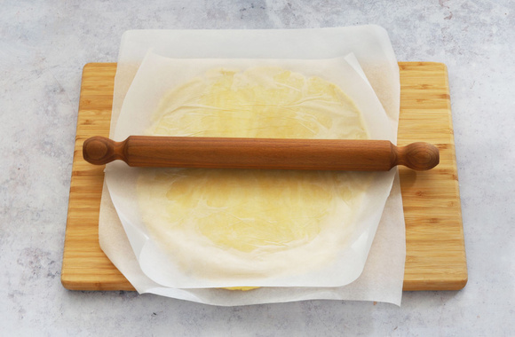 A l’aide d’un rouleau à pâtisserie, étalez la pâte entre deux feuilles de papier sulfurisé.