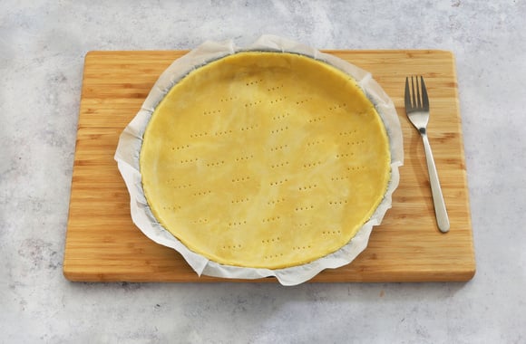 9Ensuite, foncez un moule à tarte de 26 cm de diamètre avec la pâte, en lui laissant une feuille de papier sulfurisé en dessous. Piquez le fond de la pâte avec les dents d'une fourchette. Parez les bords avec un couteau.