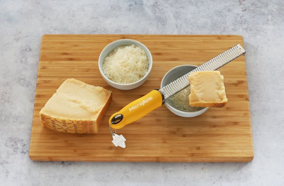 1Râpez la quantité de Grana Padano pour la pâte avec une râpe Microplane, versez dans un bol.