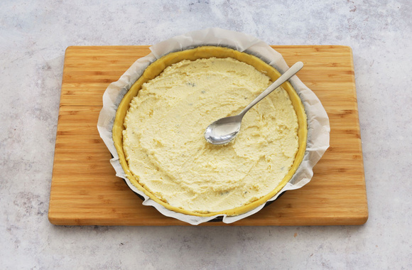 10Versez la garniture dans le fond de tarte, étalez bien avec le dos d'une cuillère à soupe.