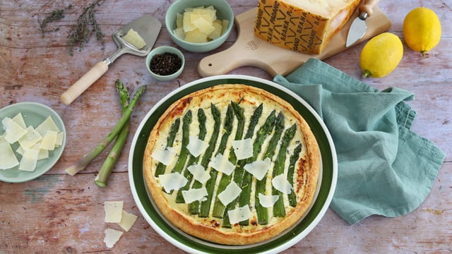 Une tarte salée printanière et savoureuse, grâce au mariage entre le fromage Grana Padano AOP et les asperges vertes. Cette tarte est idéale pour le buffet d'un apéritif dînatoire, pour un pique-nique ou encore comme plat, avec une belle salade verte en accompagnement.