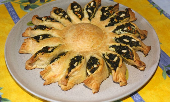 Préchauffez le four à 200°C. Avec un couteau tranchant, découpez des bandes de 3 cm tout autour de la tarte garnie en commençant à 1 cm de l'emplacement du bol ou ramequin du milieu.Retournez chaque bande de pâte découpée afin que la farce soit visible. Enlevez le bol ou le ramequin du milieu puis piquez à la fourchette l'empreinte laissée par le bol ou le ramequin. Disposez quelques pignons sur chaque alvéole. Enfournez et laissez cuire pendant 30 minutes environ.