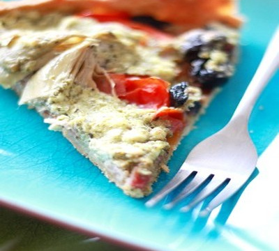 Lavez les tomates et coupez-les en fines tranches. Déposez-les sur le fond de tarte. Répartissez ensuite les olives et le jambon coupé en petits dés ainsi que les quartiers de coeurs d'artichaut.