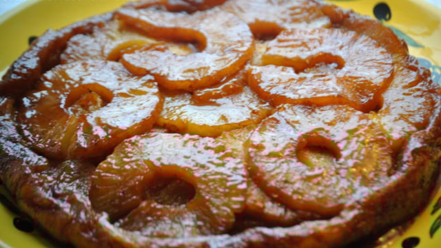 Répartissez dedans les rondelles d ananas . Versez le reste de caramel et superposez le reste d ananas . Laissez refroidir . Posez la pâte sur les tranches d ananas en rabattant les bords vers l'intérieur. Faire chauffez votre four à 210°c ( th7 ) . Enfournez la tarte 10 mim , puis baissez la température à 180°c ( th6 ) . Laissez cuire encore 25 min jusqu à ce que la pâte soit dorée . Démoulez aussitôt en retournant sur un plat de service . Accompagner cette tarte d une crème anglaise , ou chantilly . Pour plus d idées venez faire un tour sur mon blog .aux délices du sud . A très bientôt !