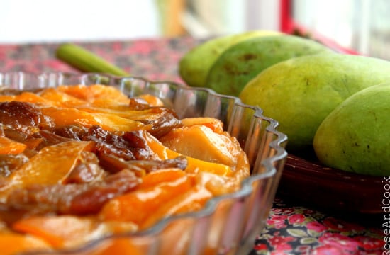 Une tarte tatin originale avec de la mangue et de la rhubarbe confite