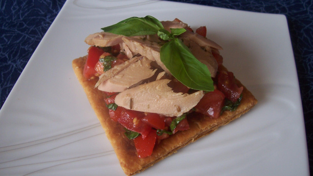Bien égoutter les tomates (pour ne pas détremper la pâte feuilletée) avant de les disposer sur les carrés de feuilletage cuits et refroidis. Disposez sur les tomates les émincés de thon au romarin et persil bien égouttés sur une feuille de papier absorbant. Décorez avec des feuilles de basilic et dégustez en entrée.