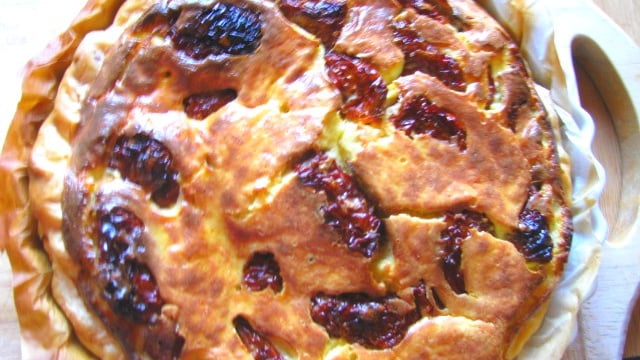 Étaler la pâte dans un moule à tarte, piquez la avec une fourchette et verser la préparation.