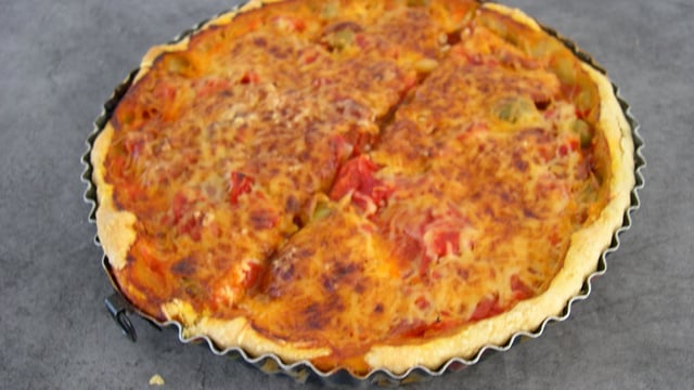 Tarte avec tomates oignons et olives jambon
