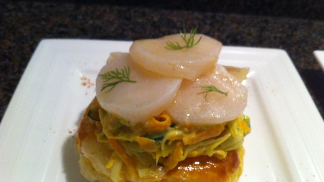 Vous pouvez utiliser une julienne de légumes surgelés. Pour les réfractaires aux saint-jacques crues, vous pouvez poêler les lamelles de saint-jacques juste avant de les disposer sur les tartelettes