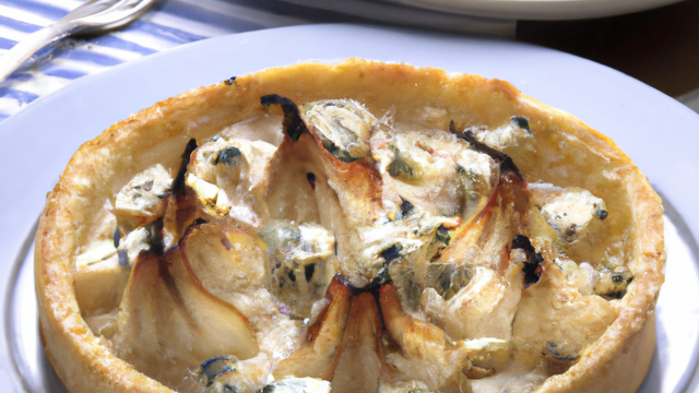Tartelette de pâte feuilletée, poire tranchée, lamelle de Roquefort, miel et graines de sésame.
