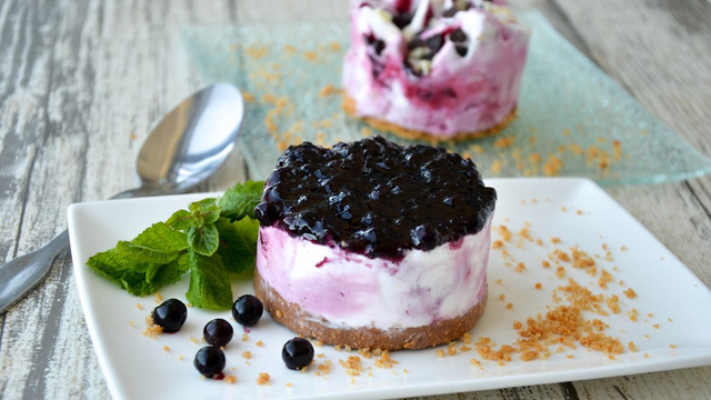 Un fond de pâte à cheesecake garni de Glace Carte d"Or® Façon Glacier saveurs Myrtille et Vanille, surmonté d'un disque de coulis de myrtilles gélifié.