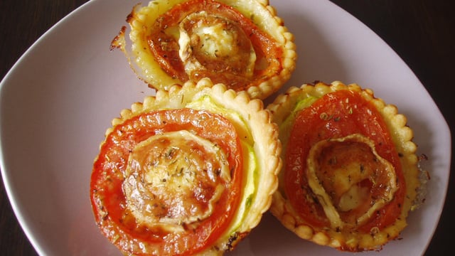 Placez en rosace les lamelles de courgettes, puis une rondelle de tomate, puis la rondelle de chèvre.