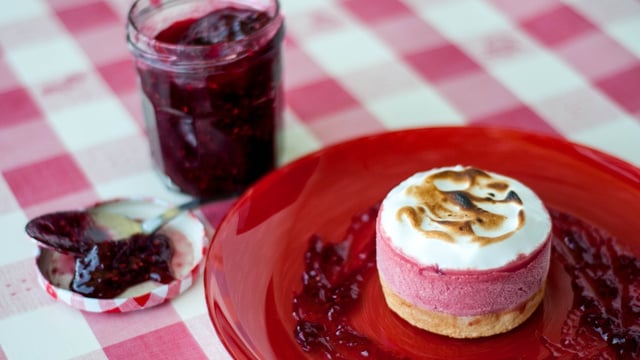 Fond de pâte sablée tapissé de confiture de framboises, surmonté de sorbet plein fruit Framboise Carte d"Or® et recouvert d'une meringue caramélisée.