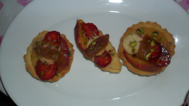 Découper les fruits en tranches (mettre à cuire les tranches de pomme, pêche et dattes dans un peu d'eau et de sucre).