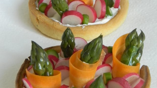 Ciseler la ciboulette,l'incorporer au St-Môret. Déposer le fromage dans les fonds de tarte puis disposer les légumes harmonieusement.