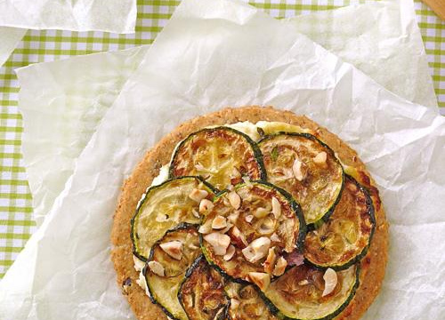 Retirer du four. Tartiner chaque rond de pâte du mélange Philadelphia / parmesan. Disposer les rondelles de courgettes. Parsemer de noisettes.
