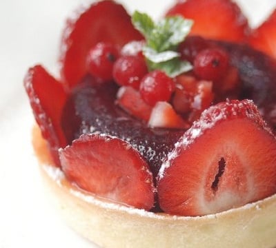 Sur un fond de pâte, une gelée de fruits rouges et des fraises fraîches