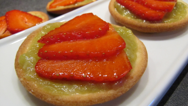 Voici des petites tartelettes toutes simples, composées d'une pâte sablée, d'une compotée de rhubarbe légèrement vanillée et de fines tranches de fraises.