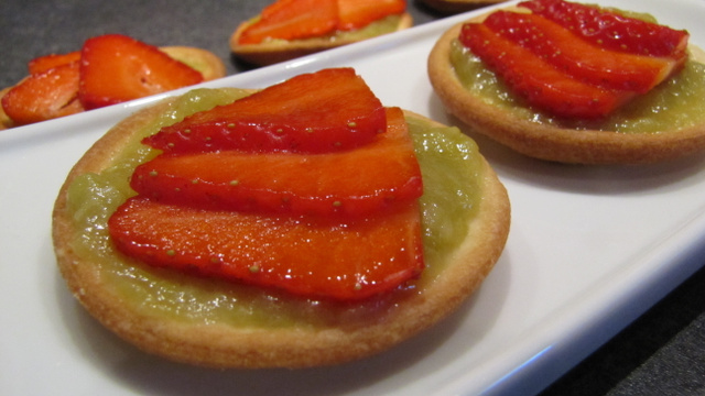 Voici des petites tartelettes légères et acidulées. Les fraises sont posées sur une compotée de rhubarbe légèrement vanillée.