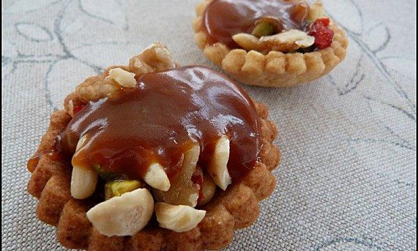 Disposer les fonds de tarte sur un plateau. Casser les fruits secs et disposer les sur les fonds de tarte (ou d'autres fruits secs). Couvrir avec la sauce caramel. Laisser refroidir et déguster