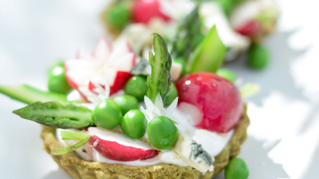 Garnir les tartelettes de la crème puis répartir joliment les légumes, le Roquefort coupé en petits bâtonnets et les fleurs.