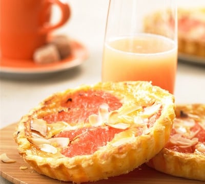 Pelez les pamplemousses à vif et récupérez les suprêmes (quartiers sans peau). Répartissez ces suprêmes de pamplemousse sur les fonds de tarte.