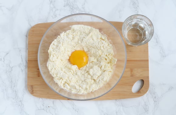 Ajoutez l’œuf puis l’eau petit à petit jusqu’à obtenir une pâte homogène.
