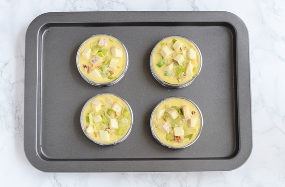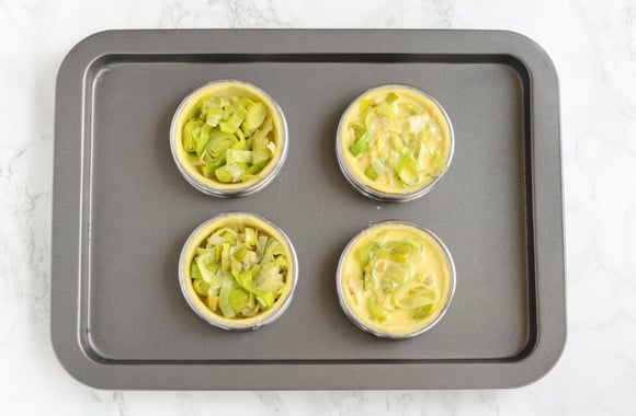 8Garnissez les tartelettes de rondelles de poireaux et versez la crème par-dessus.