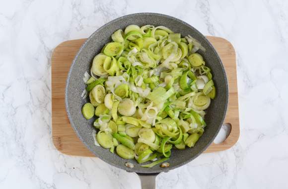 4Faites fondre le beurre dans une poêle et faites revenir les rondelles de poireaux pendant 8 minutes. Salez et poivrez.