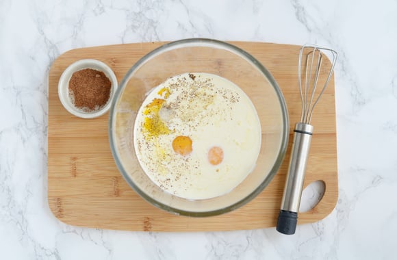 6Dans un saladier, fouettez les œufs avec la crème liquide, la muscade, le sel et le poivre.