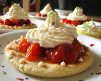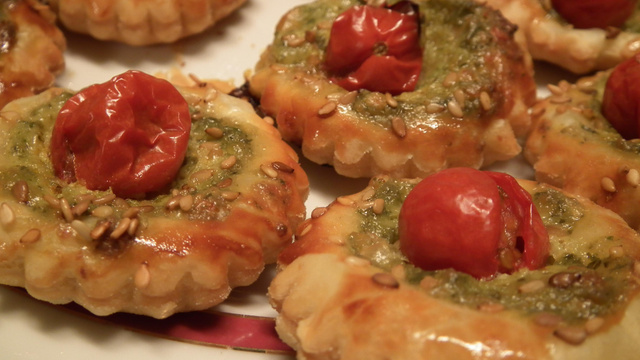 Les badigeonner de jaune d'oeuf et déposer au centre, une cuillère à café de pesto. Rajouter une tomate cerise en appuyant légèrement et saupoudrer de graines de sésame. Enfourner et laisser cuire 15 mn.