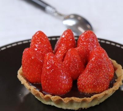 Faites chauffer la crème jusqu'à frémissement, hachez le chocolat et versez la crème chaude dessus ; ajoutez le beurre et mélangez délicatement pour que l'ensemble soit bien fondu. Versez dans les fonds de tartes. Laissez refroidir au moins 3 h. Démoulez les tartelettes. Équeutez les fraises et disposez-les sur les tartelettes au moment de servir. Faites tiédir la gelée de fraises et badigeonnez-en légèrement les fraises au pinceau pour donner de la brillance.