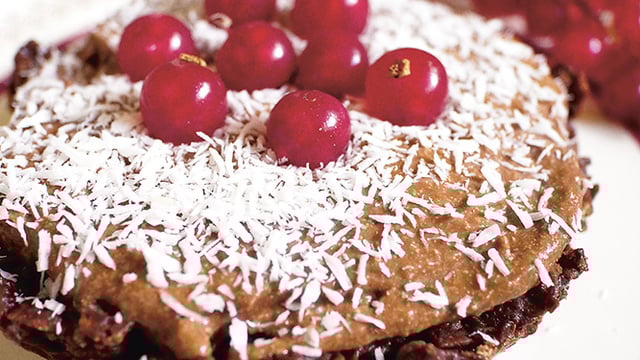 Au moment de servir, garnir les fonds de tartelette de mousse au chocolat, saupoudrer de noix de coco râpée et parsemer de groseilles.
