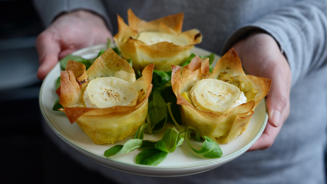 Garnissez les feuilles de brick de poireaux cuits puis ajoutez une rondelle de chèvre au centre.