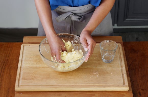 4Malaxez jusqu’à ce que vous obteniez une pâte lisse. Travaillez légèrement la pâte et formez une boule. Aplatissez-la légèrement puis roulez-la dans du film alimentaire et laissez reposer 30 minutes au frais.