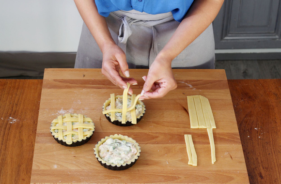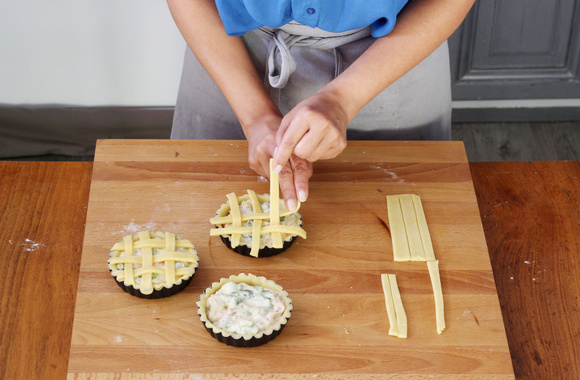 12Décorez en croisillons avec les bandes de pâte, en plaçant d'abord les bandes verticales et ensuite celles horizontales.