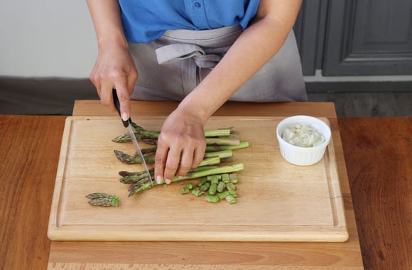 5Coupez les talons d'asperges puis coupez le reste en rondelles en gardant les pointes entières.