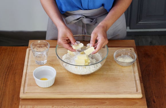 2Dans un saladier mettez la farine, faites un puits et ajoutez le beurre en petits dés. Mélangez jusqu’à ce que vous obteniez un gros sable farineux.