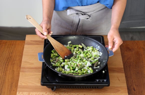 6Dans une poêle, ajoutez un filet d'huile d'olive et faites revenir l'oignon. Dès qu'il devient transparent, mettez les rondelles d'asperges ainsi que les pointes. Laissez cuire 6 minutes.