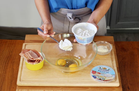 7Dans un saladier, mettez la ricotta, les œufs, le parmesan, le thym séché, le sel et le poivre. Mélangez.