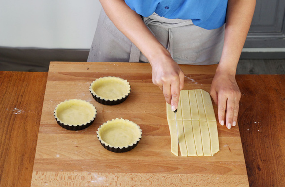 10Chemisez vos 4 moules à tartelettes. Avec le reste de pâte, coupez des bandes de longueur des mini tartes.