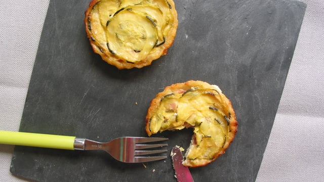 Huilez très légèrement le fond des moules à tartelettes, puis disposez les rondelles de courgettes en rosace. Salez très légèrement. Enfournez dans un four préchauffé à 180°C pendant 10 minutes. Réservez. - 2