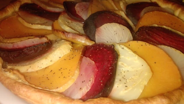 Répartissez la fondue d'oignons sur la pâte feuilletée. Alignez toutes les rondelles de légumes (céleri navet, courge, betterave) en les alternant et en les faisant se chevaucher légèrement.