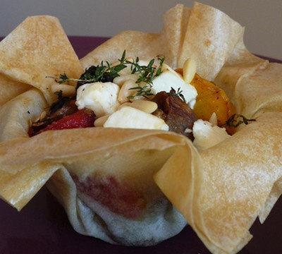 Disposez dans chaque ramequin 2 feuilles de brick (l'une sur l'autre), remplissez-les avec les légumes assaisonnés, ajoutez quelques cubes de féta, des pignons, une branche de thym.