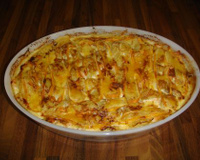 épluchez et coupez les pommes de terre en rondelles dans un plat à gratin, ajoutez l'oignon, le saumon coupé en petits morceaux.